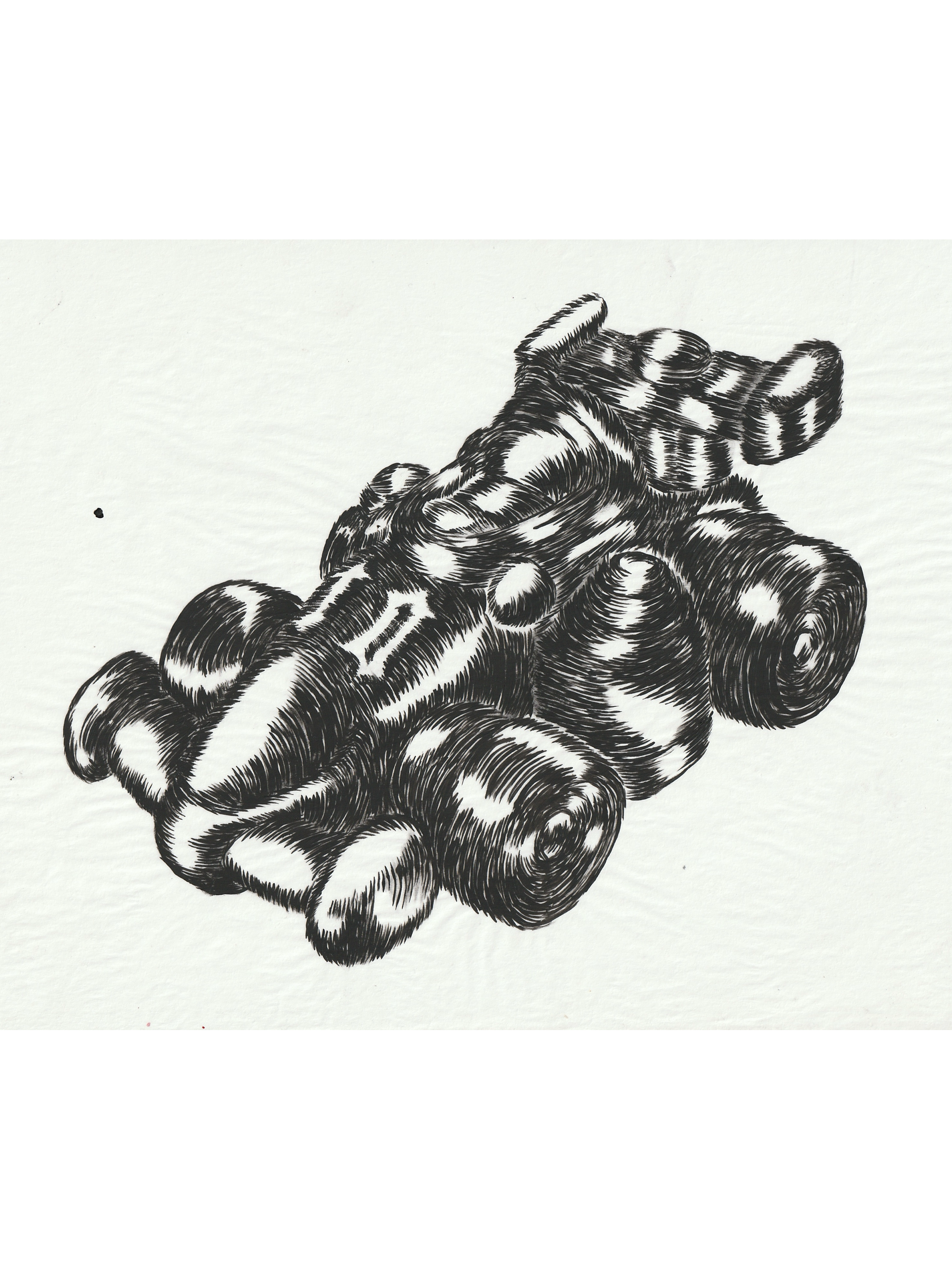Black and white illustration of a mechanical or robotic object with complex parts and gears. View fullsize