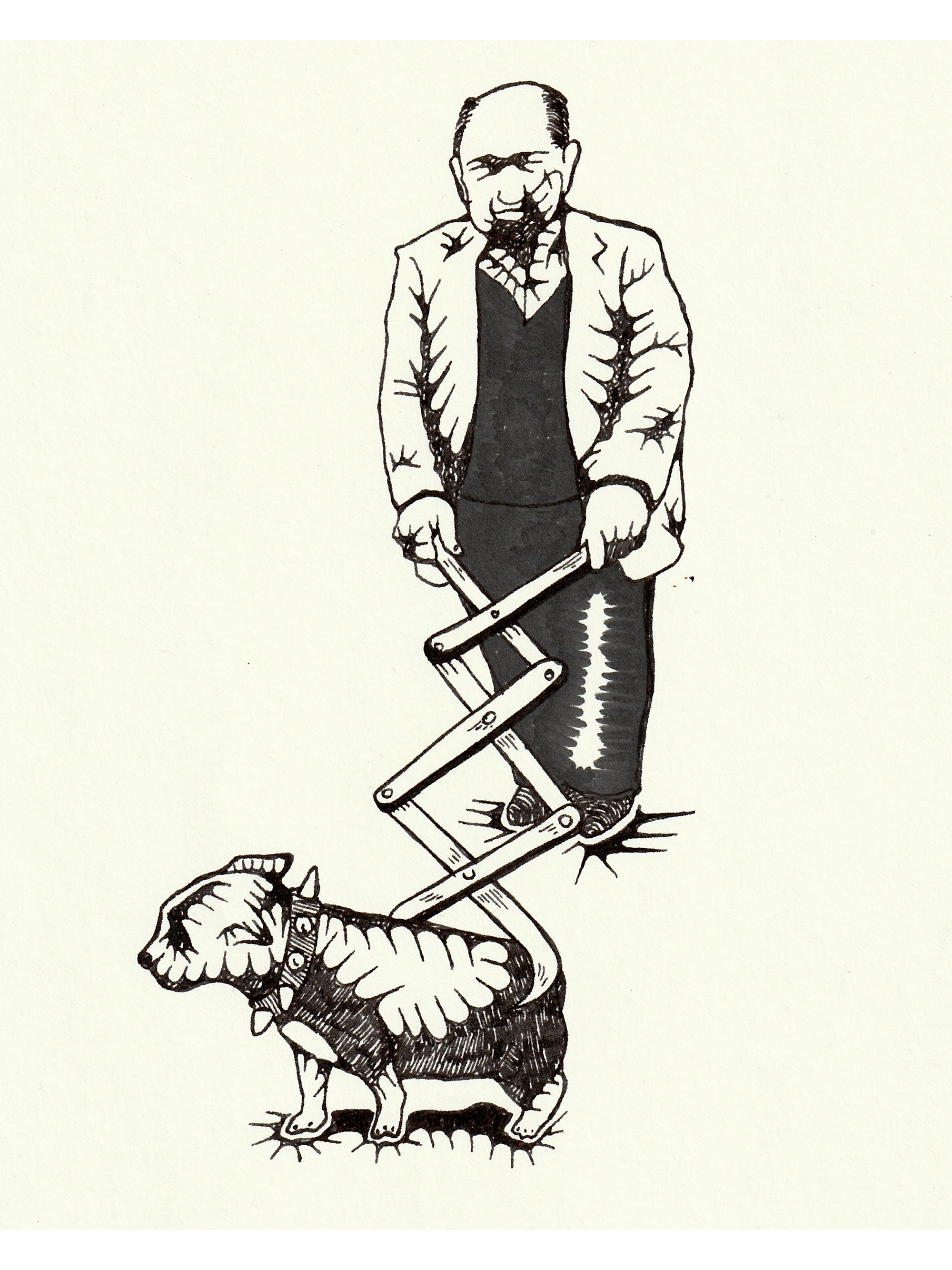 A black and white illustration of a man with a beard and glasses, holding a walking cane, standing on a dog walk with a large dog. View fullsize