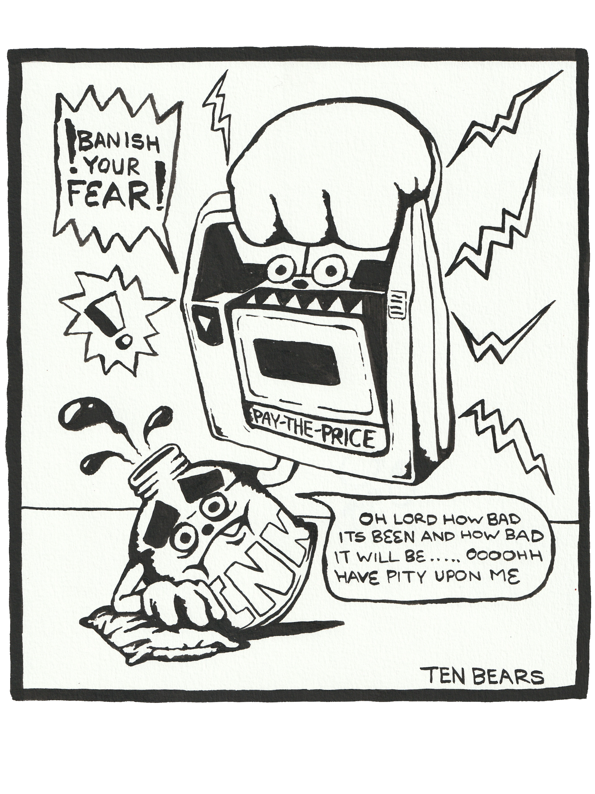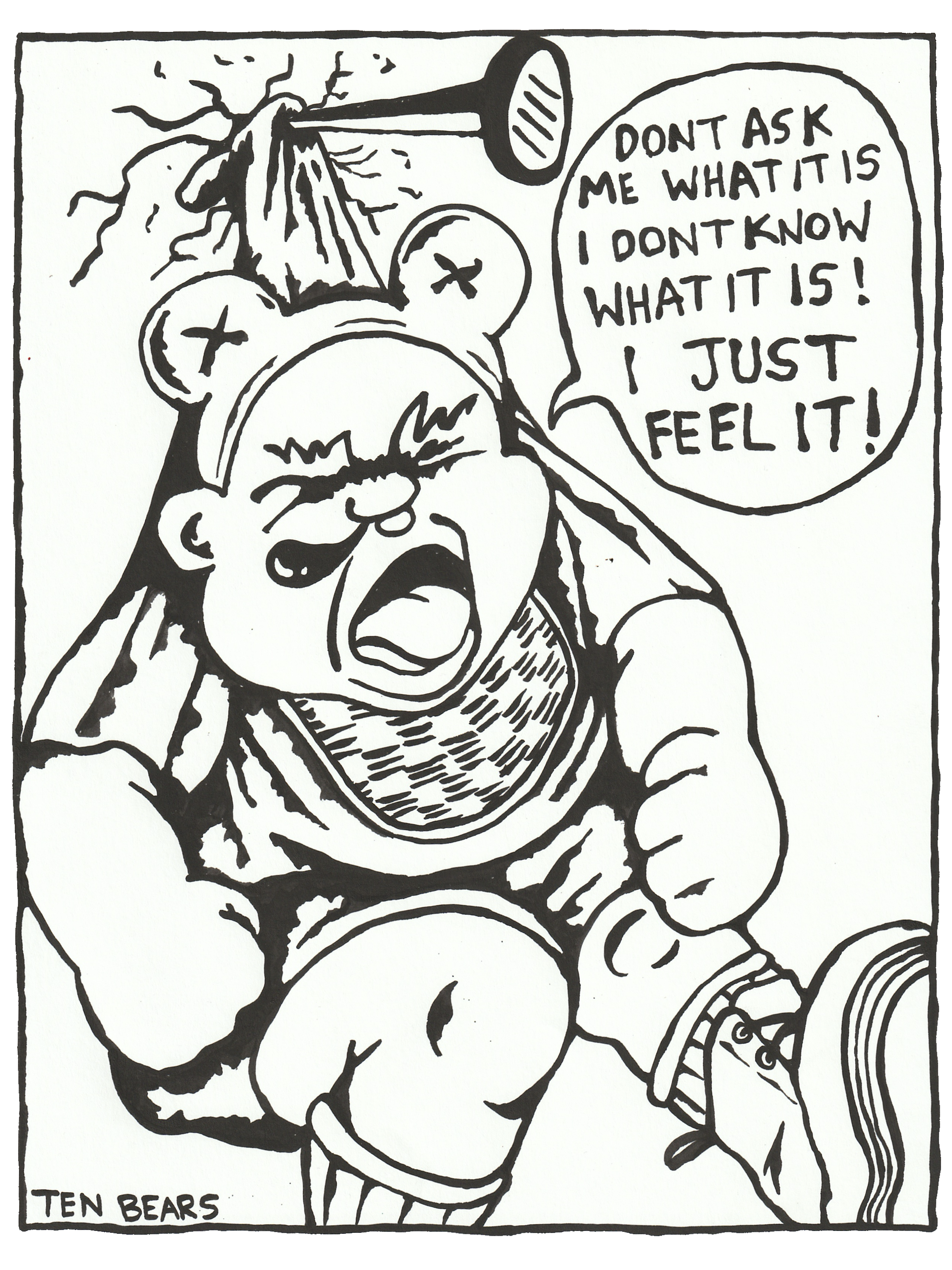 A black and white drawing of a bearish figure with an angry expression, standing on two legs, with a speech bubble saying, "Here I am regretting, I'm crying, I am growing, I'm starting over..." and the caption "Ten Bears" at the bottom right. View fullsize