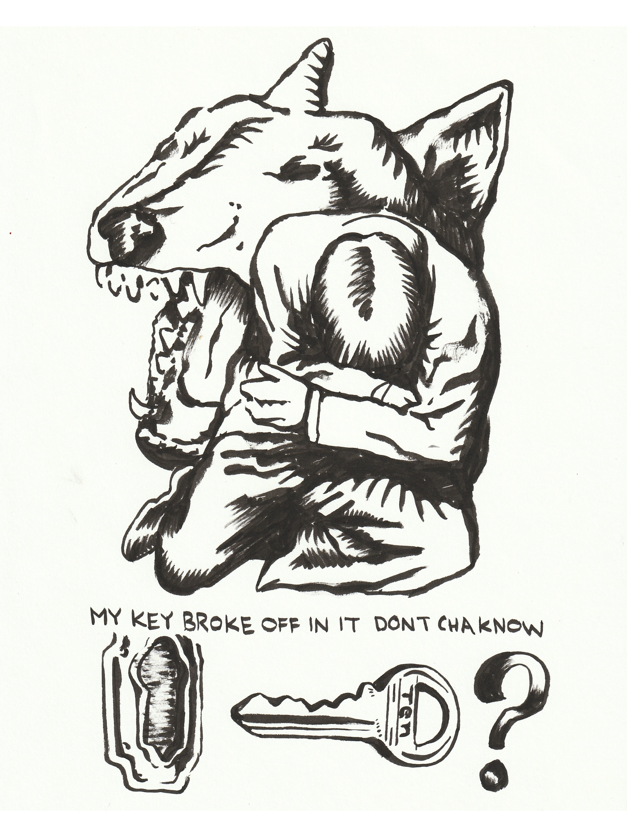 Black and white drawing of a person with a dog's head hugging their knees. Below, there is a key, a keyhole, and a question mark. The text reads: "MY KEY BROKE OFF IN IT DONT CHAKNOW." View fullsize