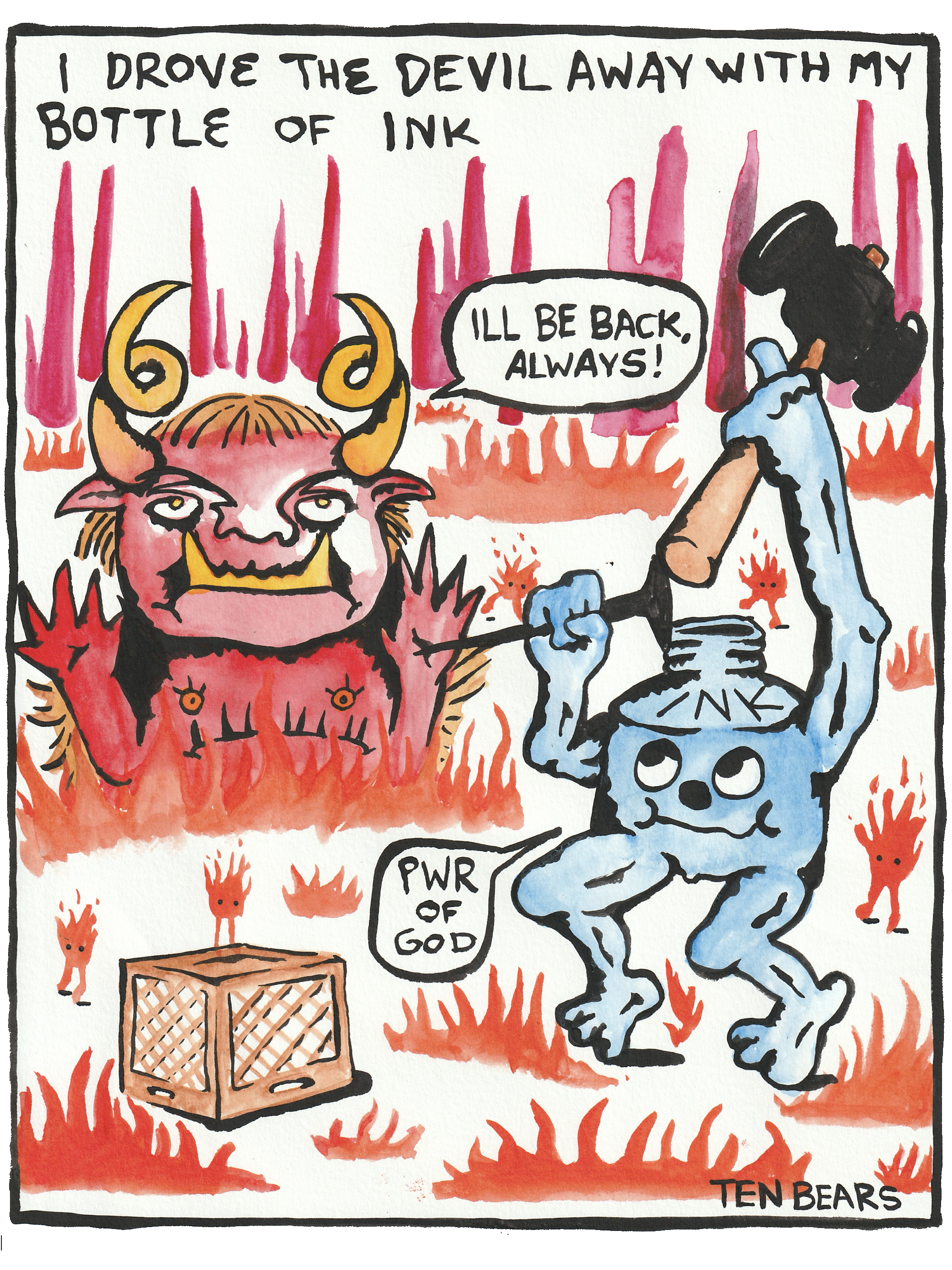 Drawing of a boy sitting on a chair with a cross behind him, holding like a key, with two large detailed feet hanging from above. Text reads, "Frustration and yer unworthiness of love." Bottom right says, "Ten Bears."