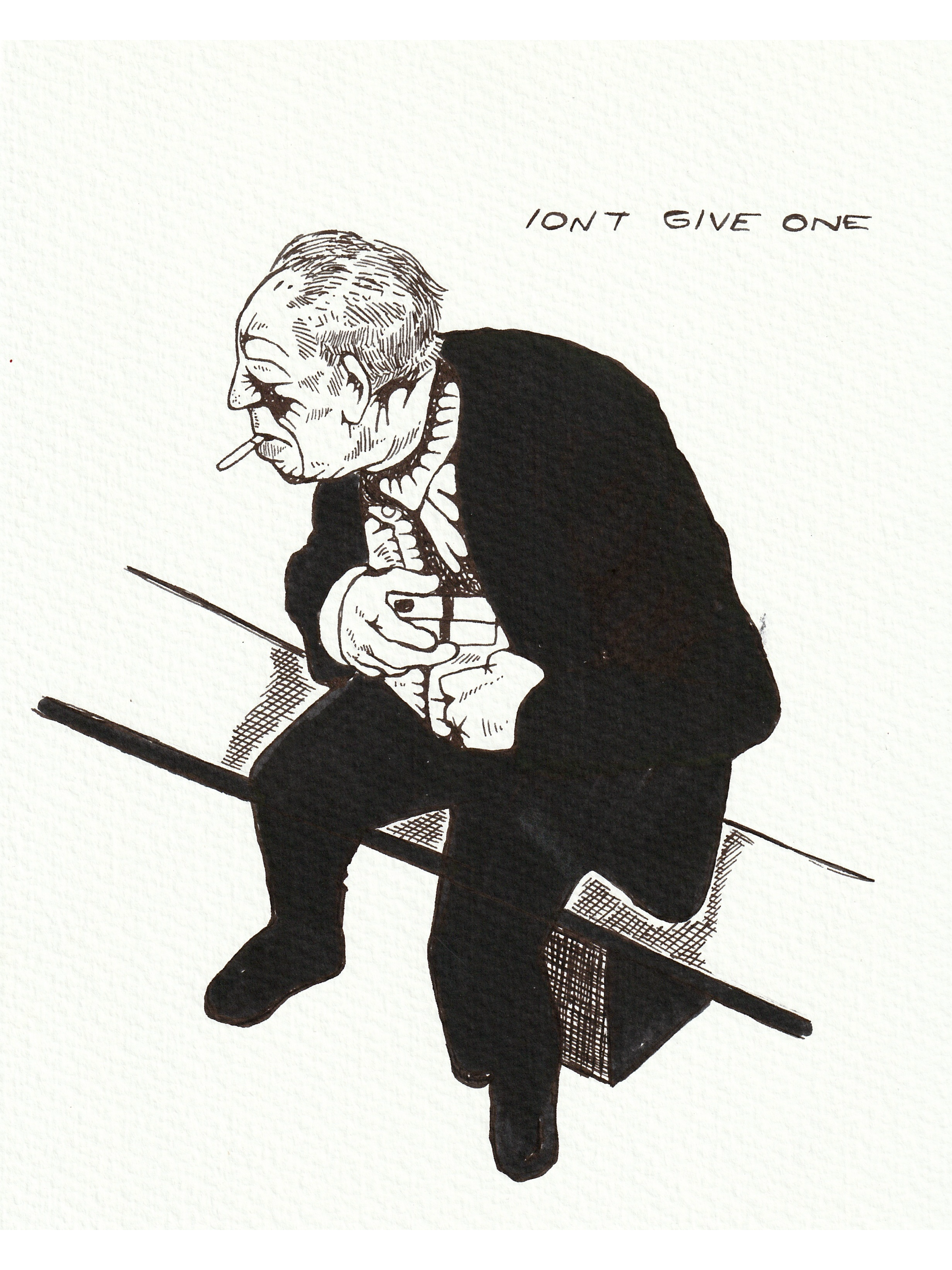 Black and white illustration of an older man sitting on a bench, smoking a cigarette, holding a drink, with the words 'I DON'T GIVE ONE' written above. View fullsize