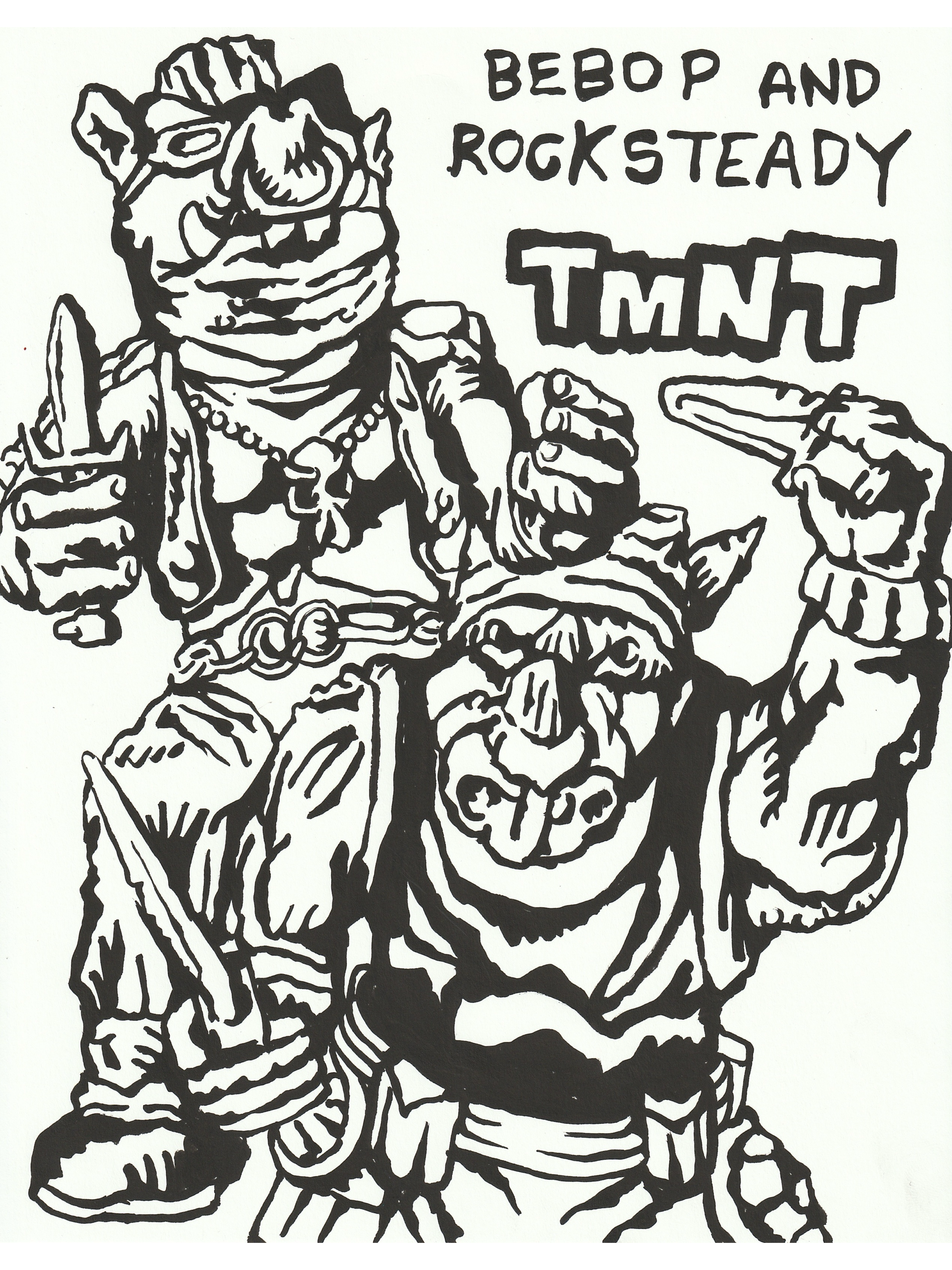 Black and white illustration of two turtles dressed as characters from Teenage Mutant Ninja Turtles, with text 'Bebop and Rocksteady TMNT' at the top. View fullsize