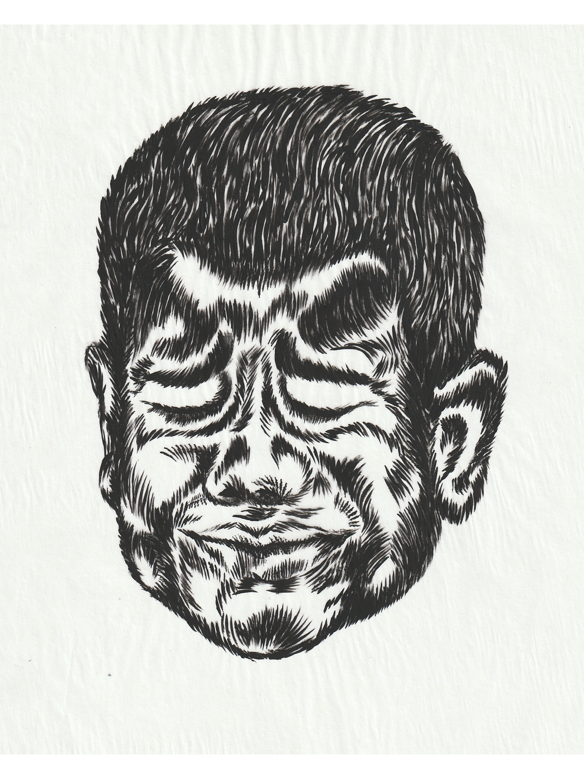 Black ink drawing of a person's face with closed eyes, a slight smile, short hair, and prominent ears. View fullsize