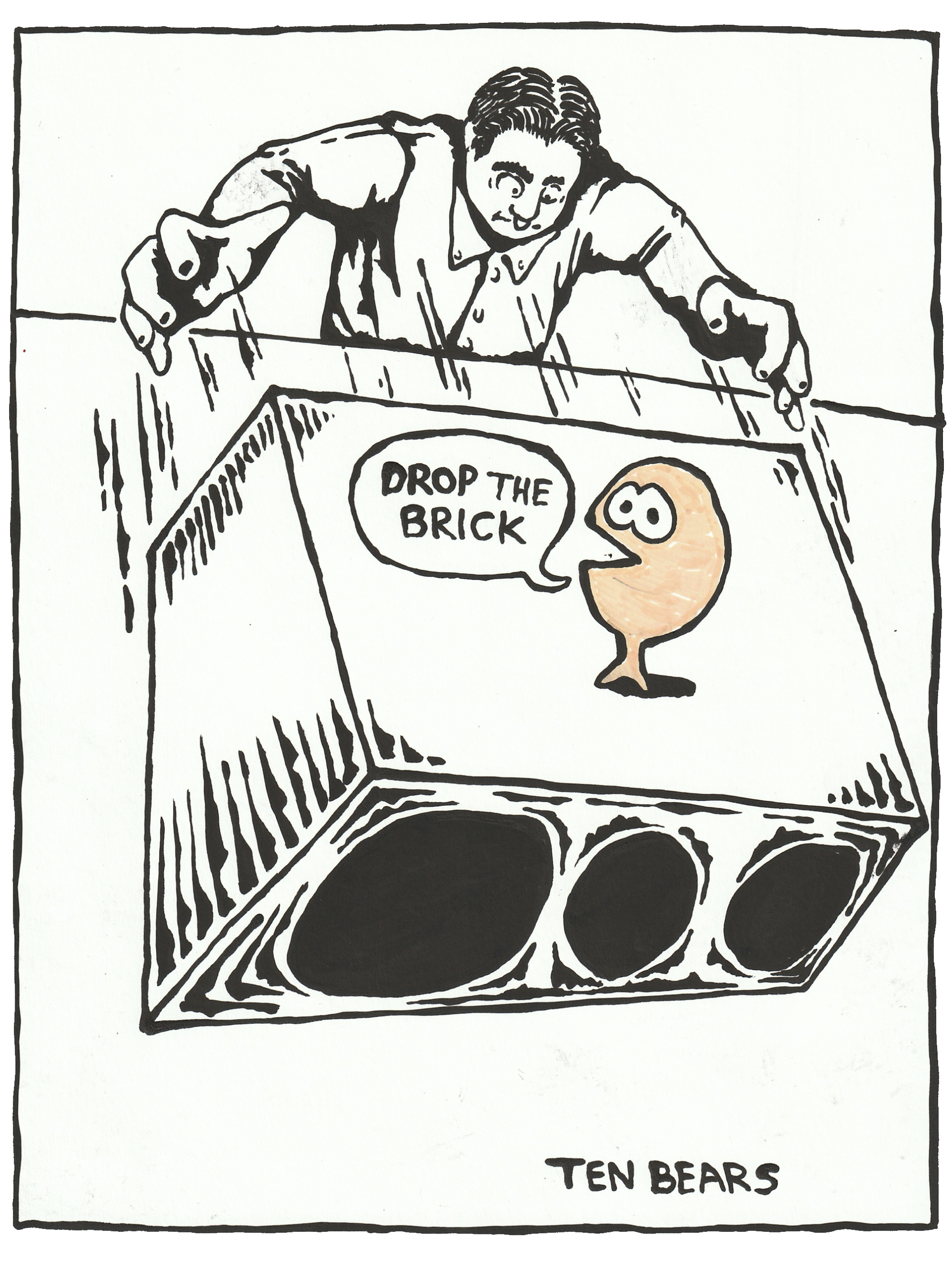 A man is leaning over a box with holes in it, watching a cartoon character inside. The cartoon character looks like a Pac-Man and is speaking, saying 'Drop the brick,' to a brown creature with big eyes. The drawing is in black and white with colored