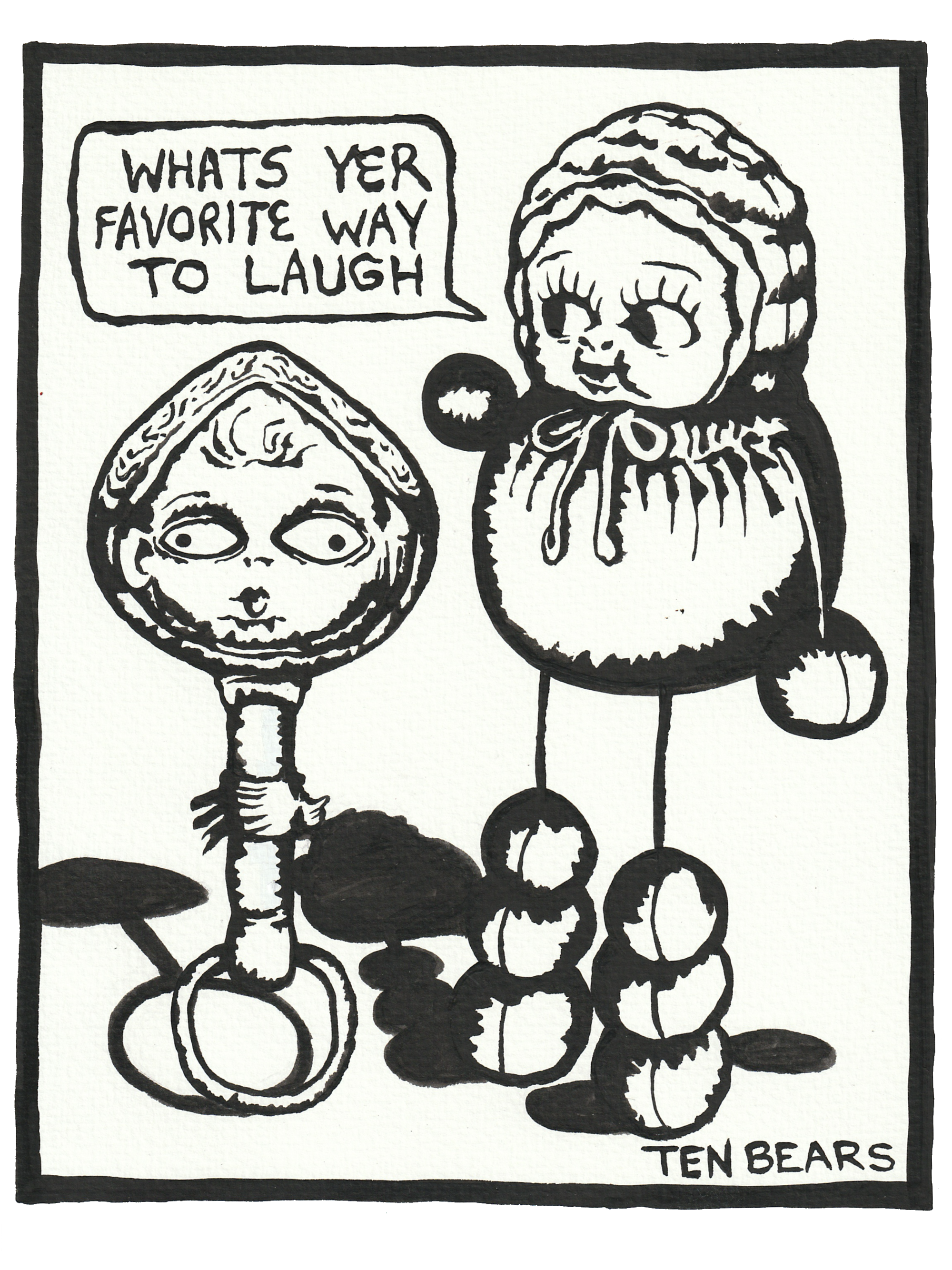 A black and white illustration of two giant human feet with two small bears at the bottom, and the text "To be crushed by God" and "Ten Bears". View fullsize